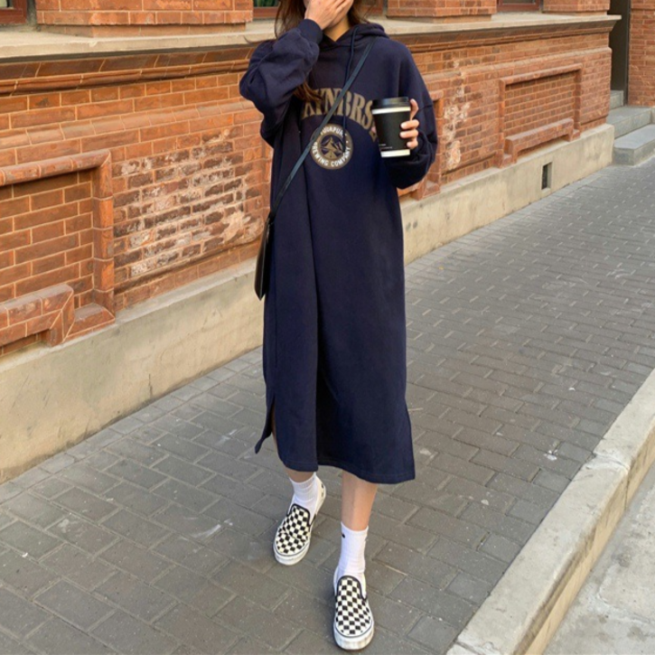 에쉬울프 여성용 기모 오버핏 레터링 포인트 후드 롱원피스 캐주얼 마실룩 홈웨어룩